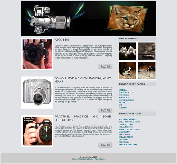Our first project in web design was to create a website on a tutorial of our choice. It had to be created using only HTML and CSS. I created a website on photography, since that is my favorite hobby. The websites were all put on a free web hosting site for us to be able to see it live. Software used was a simple text editor of our choice.