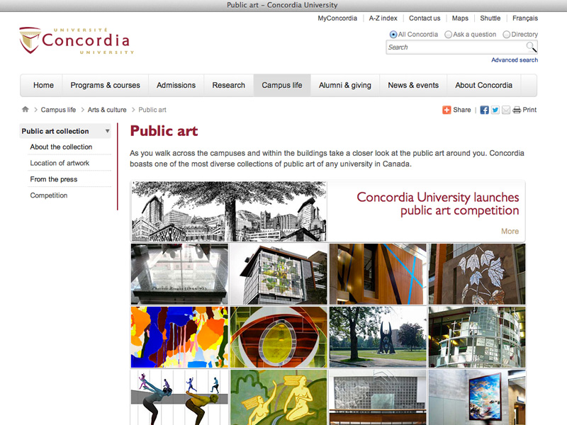 One of the very first projects that I worked on at Concordia was to migrate several websites from the old template into the newly redesigned look of concordia.ca, which was launched March 2, 2011. One of my favourites pages that I worked on were the Public Art pages. I created a landing page that featured all the public art works at the university. When you hover over each image you get the name of the artist and a description about the artwork.