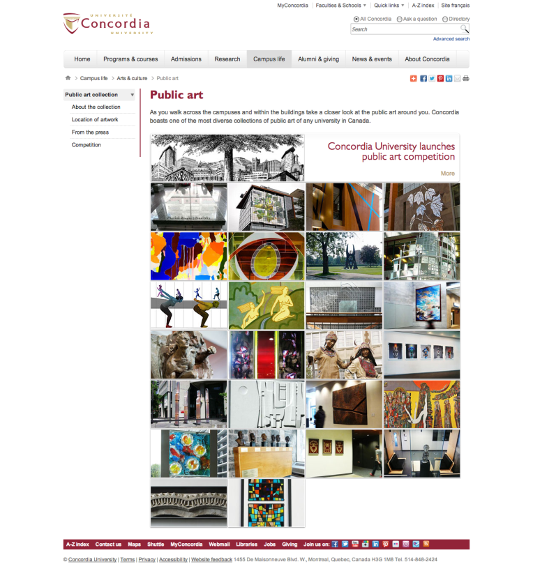 I have worked on the whole website as well as some specific pages/projects. Visit concordia.ca to see some of the pages, just to name a few, that I have created: Public Art, Public Art – Google map mash-up, Knowledge Infrastructure Program Facilities, Campus Buildings, Guide to First Year, School of Extended Learning and Human Resources