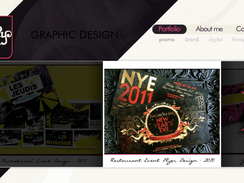 This flash-based website was created for a budding Montreal graphic designer, Jenny Gambino, to showcase her works. She had chosen a template which I then modified to her liking. Creating this website gave me a chance to put into use some of my flash skills.View website.(UPDATE: The site appears to be offline)